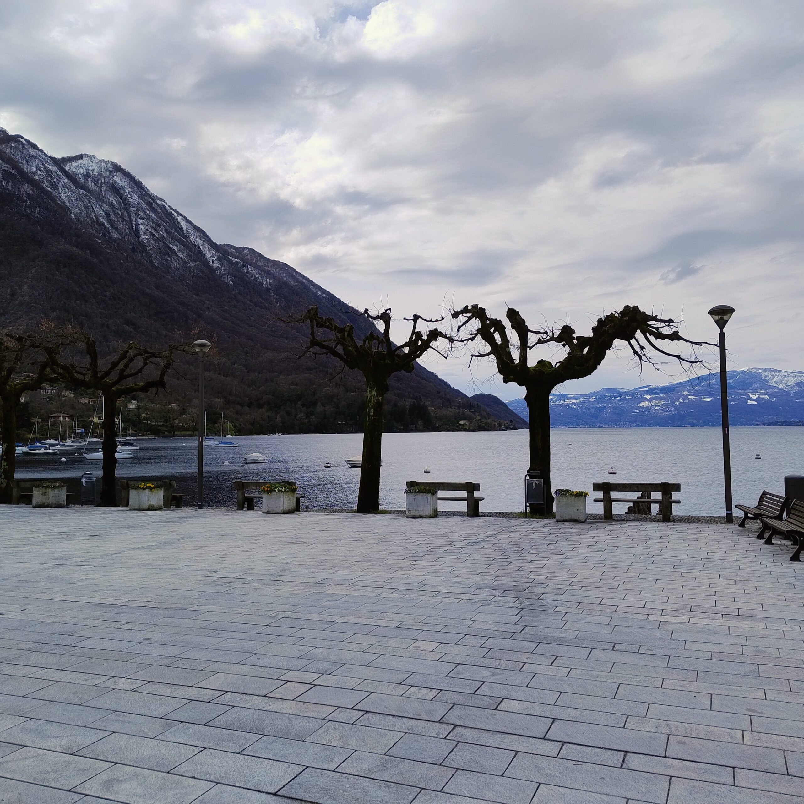 From Bodio Lomnago you drop toward the lake through Ispra. The coastal road starts talking to the water immediately — sometimes you hear it before you see it, in the way the wind changes when you pass the reeds. In March, traffic is almost non-existent. The shore is still in its winter state: ferries docked, bars with chairs stacked, the odd fisherman. There’s something honest about these shores out of season — they’re there for themselves, not for show.